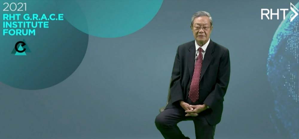 Mr Chew Heng Ching, Chairman of RHT G.R.A.C.E. Institute delivering the closing speech at the RGI Forum 2021 via live broadcast.